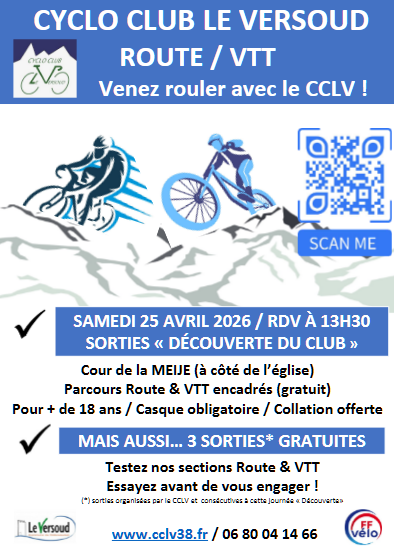 Agenda...21 mai 2025 : réunion pour les participants au w-e de la Pentecôte 2025. RDV à 20h30 à la Maison des Séniors. 7,8 et 9 juin 2025 : Week-end à Vassieux en Vercors samedi 6 septembre 2025 : forum des associations dans le parc de la Mairie de 9h à 13h. Pour rappel : vous pouvez faire 3 sorties gratuites avant de rejoindre le club si les randos vous conviennent. Vous décrouvirez l’ambiance du CCLV en toute convivialité ! 14 novembre 2025 : Assemblée générale du CCLV à 19h salle de la Maison des Séniors au Versoud Sorties VTT : voir la section VTT du forum Sorties cyclos : voir la section Cyclo du forum. |
