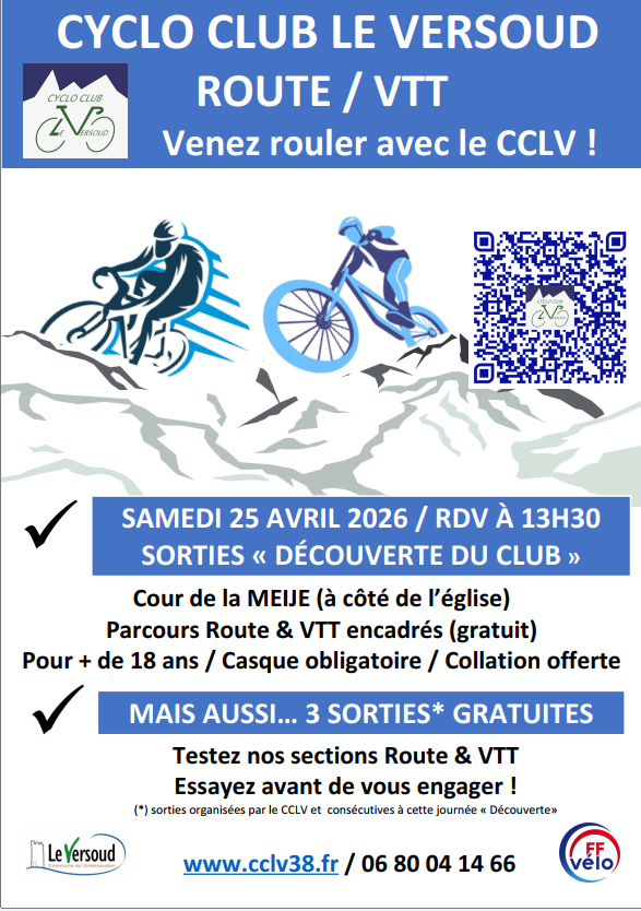 Agenda...25 avril 2026 : "Journée découverte du CCLV" au Versoud - Gratuit- RDV à 13h30 dans la cour de la Meije. Voir les infos 6 mai 2026 : Réunion des adhérents du CCLV à20h30 salle de la Maison des Séniors au Versoud (à confirmer) Sorties VTT : voir la section VTT du forum Sorties cyclos : voir la section Cyclo du forum. |
