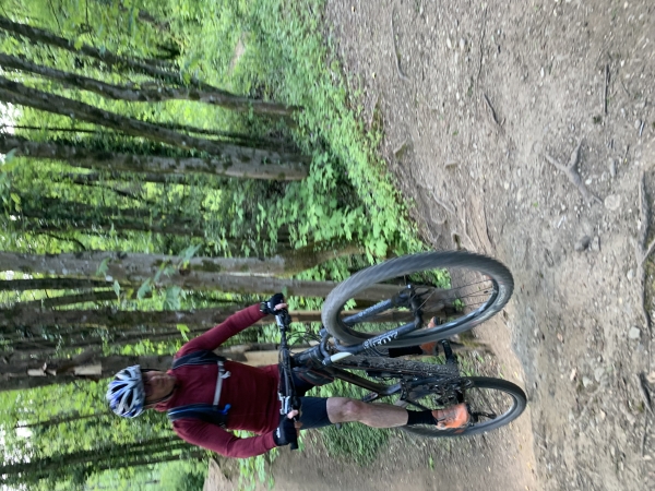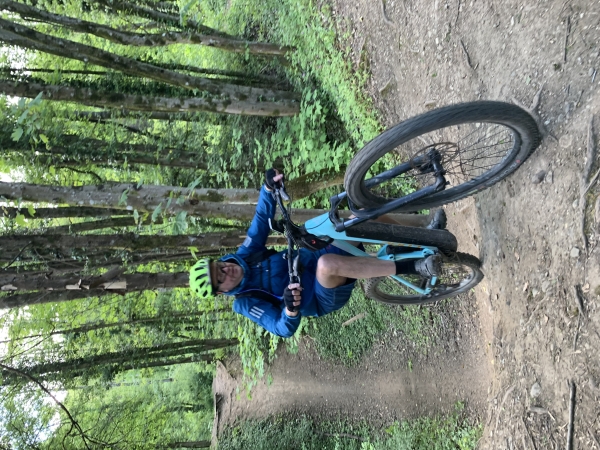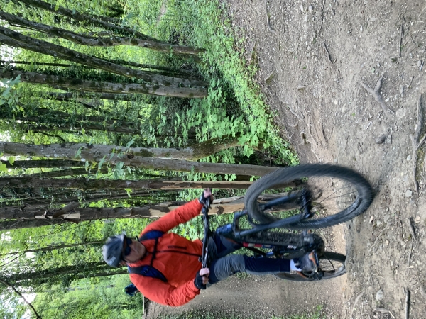 L'ensemble du groupe se constitue et on attaque la montée au Murier puis le Bigot et le chemin de traverse bien ludique en direction d'Eybens. Ensuite le single bien technique. Hugues prend une souche sur le côté qui l'envoie de l'autre côté. Il tape fort du genou sur le cadre de son VTT. Il se remet et nous poursuivons. C'est la bassine qui arrive. Certains, dont moi, l'avions déjà fait avant de savoir que Hugues avait chuté. Et là, je pars, je voulais sauter un peu et là ma pédale avait mal clipsée. Et paf, je suis déséquilibré et bing, au sol. Ça m'a paru assez long la chute (on prend pas mal de vitesse dans cette descente) mais finalement je me relève assez vite. C'est le haut de la cuisse gauche qui a pris. Ouf !