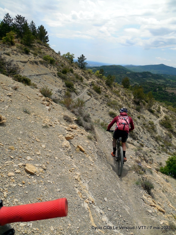On poursuit dans des paysages magnifiques jusqu'à une descente dans les terres noires. C'est somptueux ! Tout en finesse. On voit les premiers vététistes qui serpentent dans ce panorama de folie !