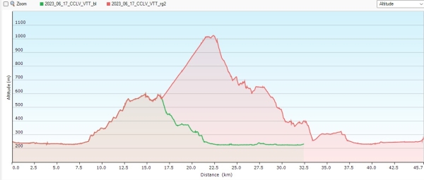 On a pris un peu d'altitude mais très loin de notre point culminant à 1029m. On est parti à 218m.